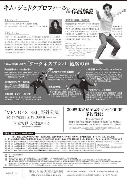 天才キム・ジェドクが振付・作曲・演出する野外公演用の新作「MEN OF STEEL」。ダンスファンはもちろん、今までダンスを観たことのない人にも『踊る。秋田』が自信を持ってお薦めする野心作!